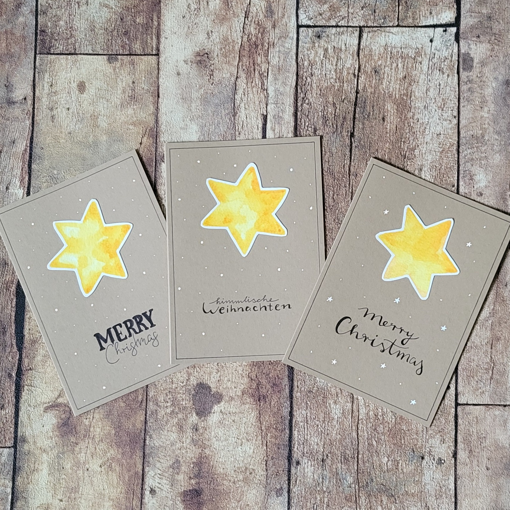 Dieses Set beinhaltet drei Klappkarten mit je einem Stern, die ich auf Aquarellpapier gemalt und