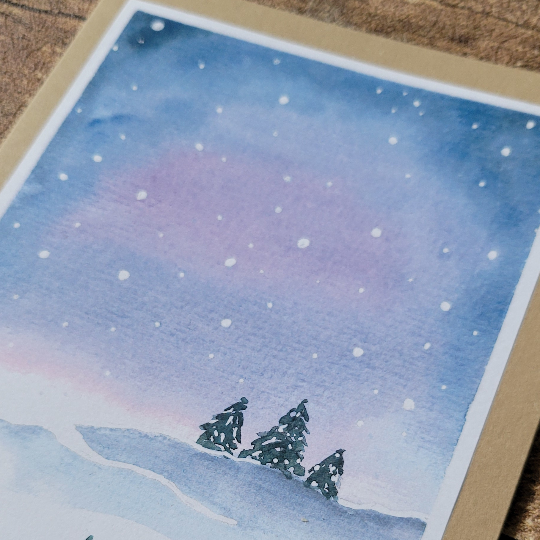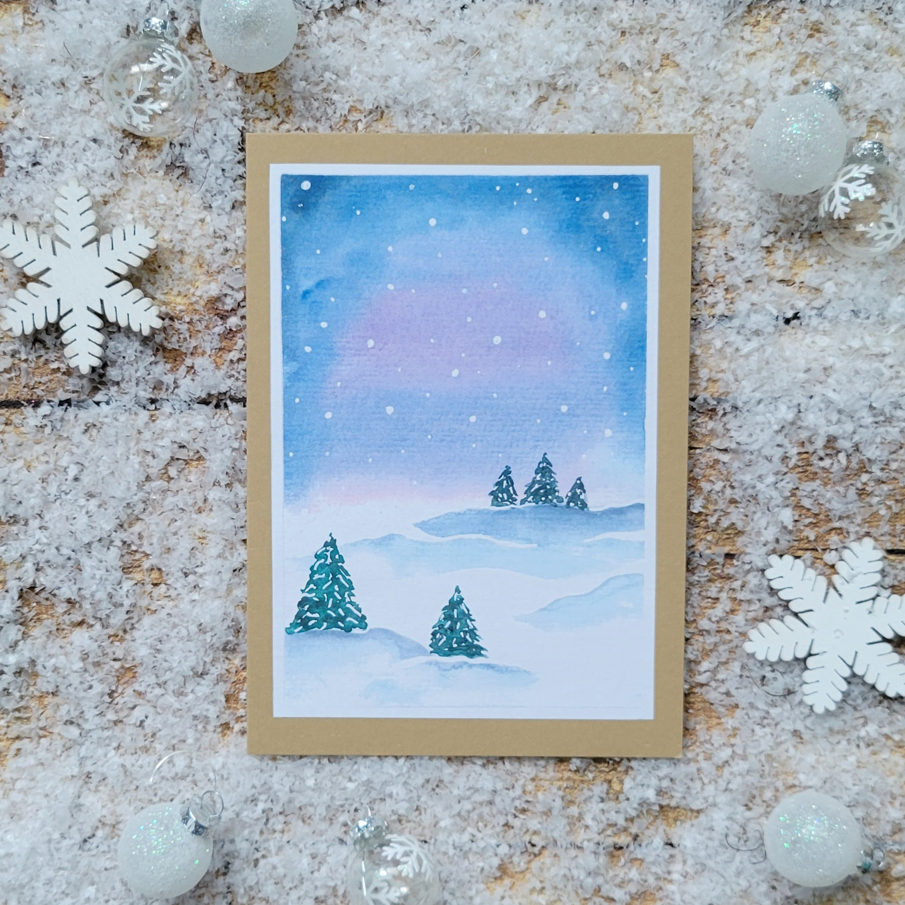Dieses Set beinhaltet zwei Klappkarten mit Kunstdrucken verschiedener verschneiter Landschaften.